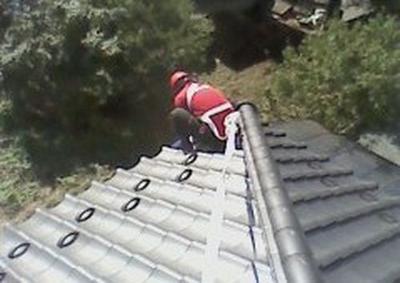 さっそく2名で屋根に登り、1名が命綱をつかんで、1名が雨樋のクリーニングです。