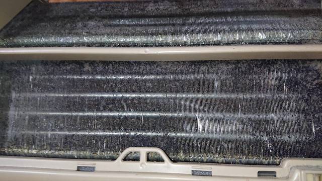 喫煙可能なテナントだったのかエアコン内部のアルミフィンにたばこのヤニがべっとり付着していました。